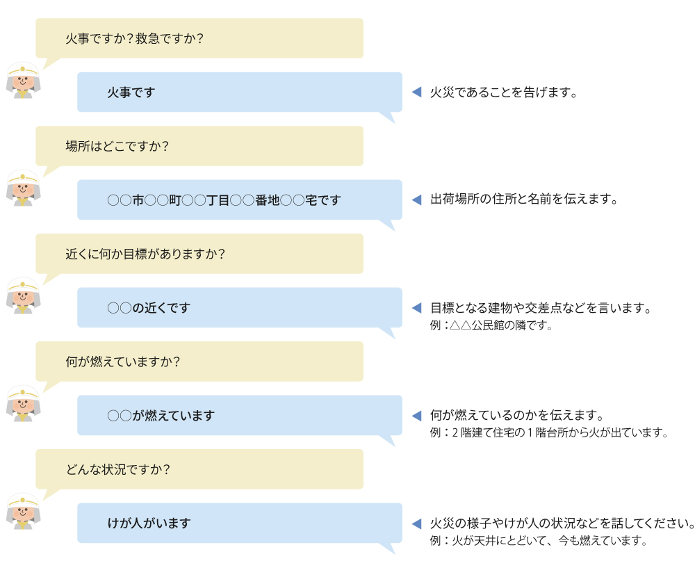 携帯電話は、地域によって通報地点と離れた地域の消防機関につながる場合もありますので、特に住所などは、正確に伝えるようにして下さい。